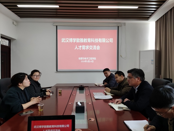 3月14日,武汉博学致雅教育科技有限公司总经理吴紫艳一行2人来院交流座谈,共同商讨毕业生招聘以及校企合作事宜。院分党委书记唐传球主持会议,LETOU线路检测中心领导班子、院办公室主任曾虎参加活动。