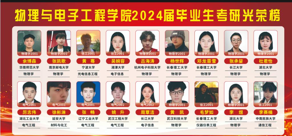 考研捷报频传,LETOU线路官网学子再展风采。随着2024年全国硕士研究生招生录取工作的圆满结束,学院2024届毕业生共有18人成功被录取,另有1人成功被国外高校录取。据统计,LETOU线路官网2024届共有184名毕业生,报考54人,录取率高达10.6%,报录率为33.3%,录取高校不乏华南师范大学、南京邮电大学、宁波大学、湘潭大学等“双一流”高校。其中,在录取学生中,物理学专业毕业生占比47.3%,也彰显了学院物理学专业人才培养成效显著。