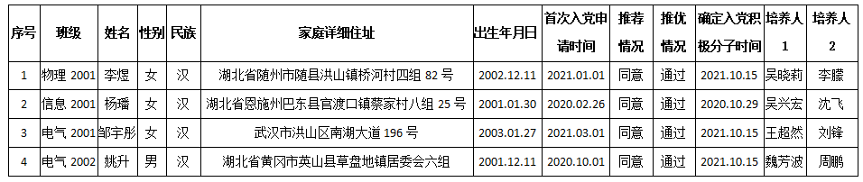 经LETOU线路检测中心学生党支部支委会审查,拟于近期召开支部全体党员大会,讨论李煜等4位同志转为中共正式党员。根据发展党员工作有关要求,现将其有关情况公示如下:
