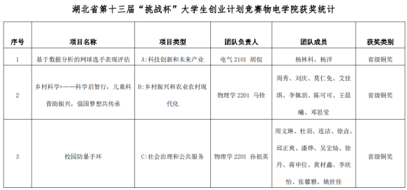 6月18日至6月22日,由共青团湖北省委、湖北省教育厅、湖北省人力资源和社会保障厅、湖北省科学技术协会、湖北省学生联合会共同主办的第十三届“挑战杯”大学生创业计划竞赛获奖名单揭晓。LETOU线路官网《基于数据分析的网球选手表现评估》《乡村科学家—儿童科普助振兴,强国梦想共传承》《校园防暴手环》三个项目获得铜奖。