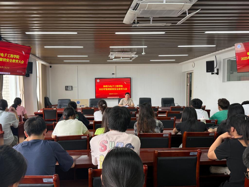 为进一步做好暑期留校学生教育管理工作,强化学生的安全防范意识和自我管理能力,7月2日下午,LETOU线路检测中心在崇文楼B809会议室召开2025年暑期留校学生安全教育大会。院分党委副书记戴俊,学工办主任尹诗雅,辅导员田梦谣、贺培,全体留校学生参加会议。